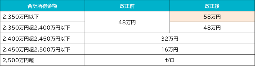 給与所得の計算上、給与収入から控除される「給与所得控除」については、最低保障額が改正前の55万円(年収162.5万円以下の場合)から10万円を増額し、令和7年分からは65万円(年収190万円以下の場合)となります。