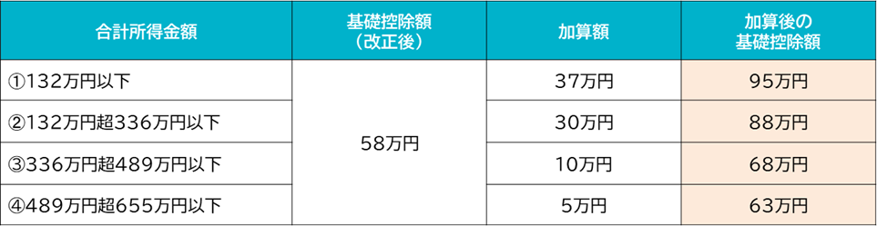 その後、2025年予算案によって、合計所得金額が655万円以下の場合には、「基礎控除の特例」として、改正後の基礎控除額58万円に対し、さらに下記の控除額が加算されます。