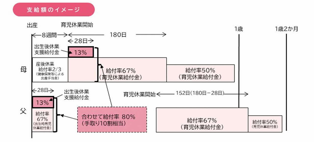 従来の育児休業給付の67%と合わせると、賃金の80%に達するため、手取額の10割相当額が支給されることとなります。